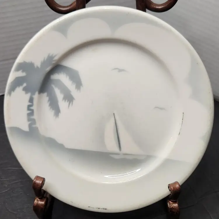 Syracuse China 1940's 50's Pale Blue Palm Tree Sailboat Beach Island Plate