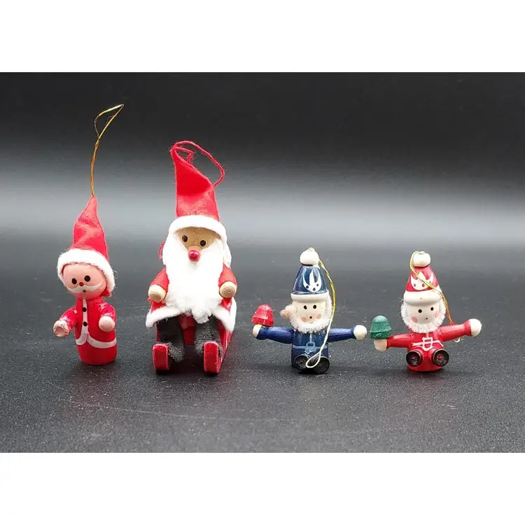Set Of 4 Vintage Wooden Santa Ornaments