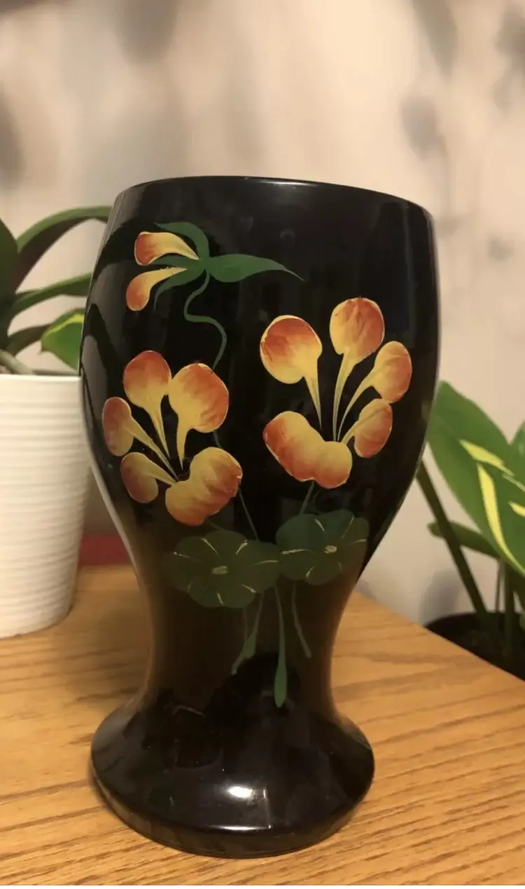 8” Vintage Vase Black Glass Hand painted Flowers