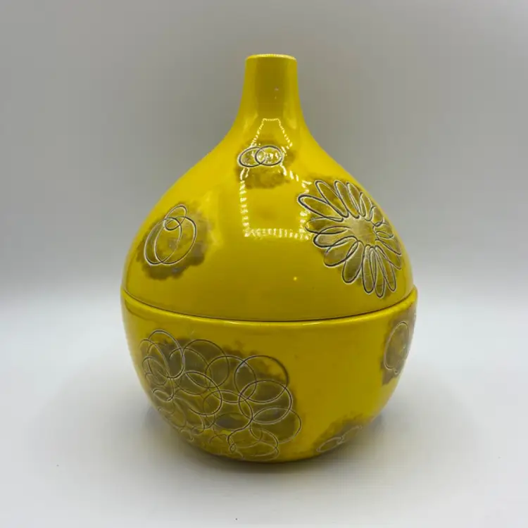 Vintage Rare Bitossi Italian Pottery Yellow Teardrop Shape Covered Dish, Yellow Abstract Floral Covered Dish