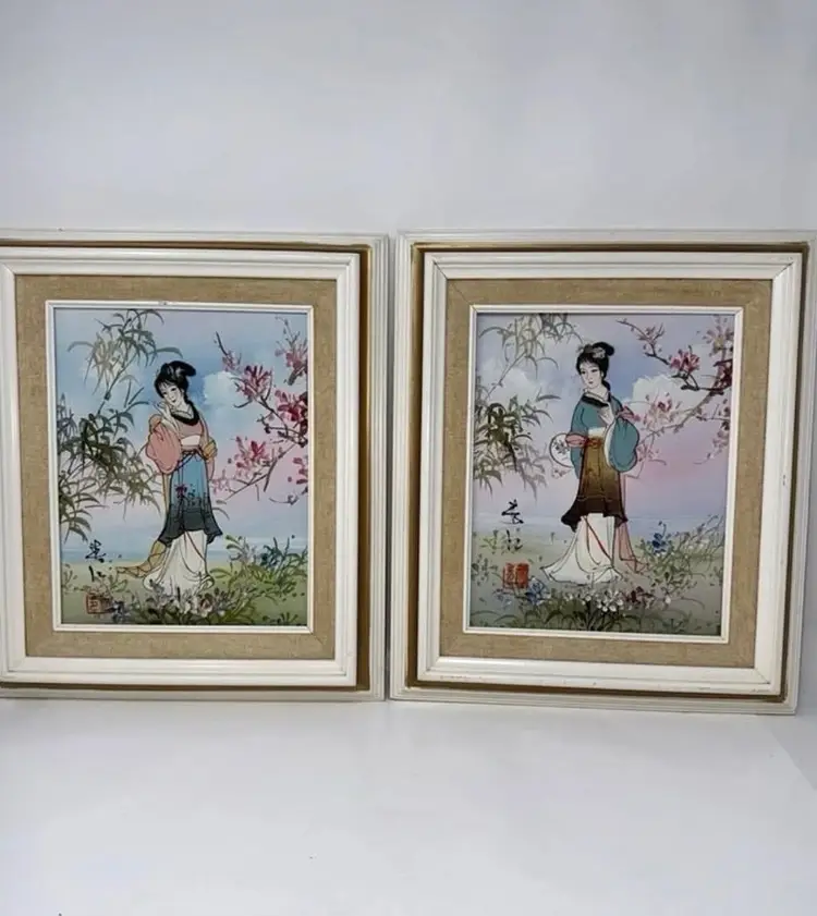 2 Oil Painting Chinese Women Pink Garden Framed Signed Mau Ling 14.5” X 12 1/4