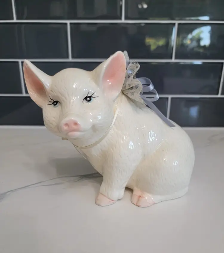 Vintage Porcelain Piglet With Floral Bow - Piggy Bank