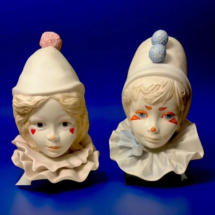 Pair Cybis Porcelain Clown Heads on Wooden Base SET Funny Face & Valentine VTG