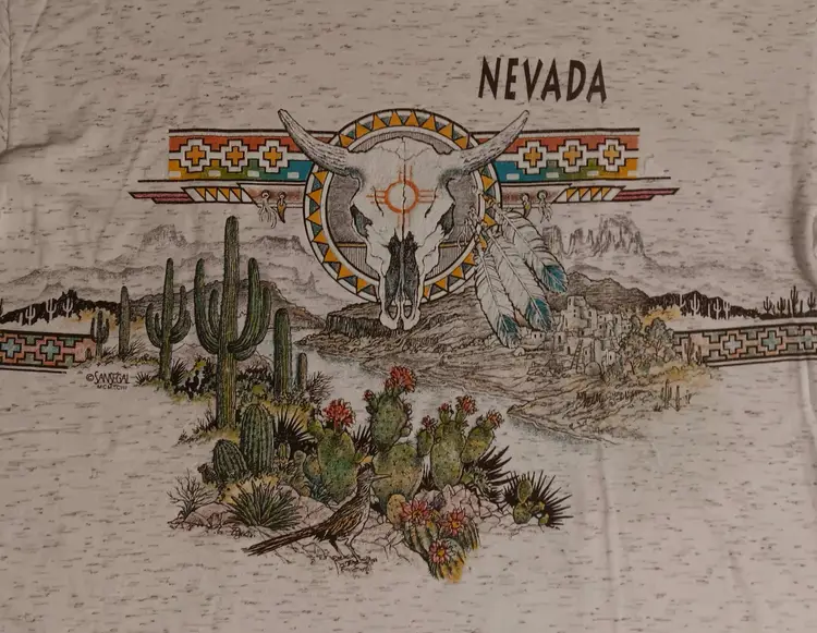 Vintage single stitch Nevada t-shirt Large Sansegal AOP Skull Roadrunner