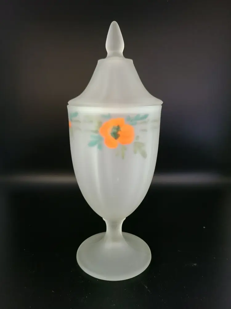 Vintage Frosted Satin Glass Lidded Candy Dish Jar Reverse Painted Floral