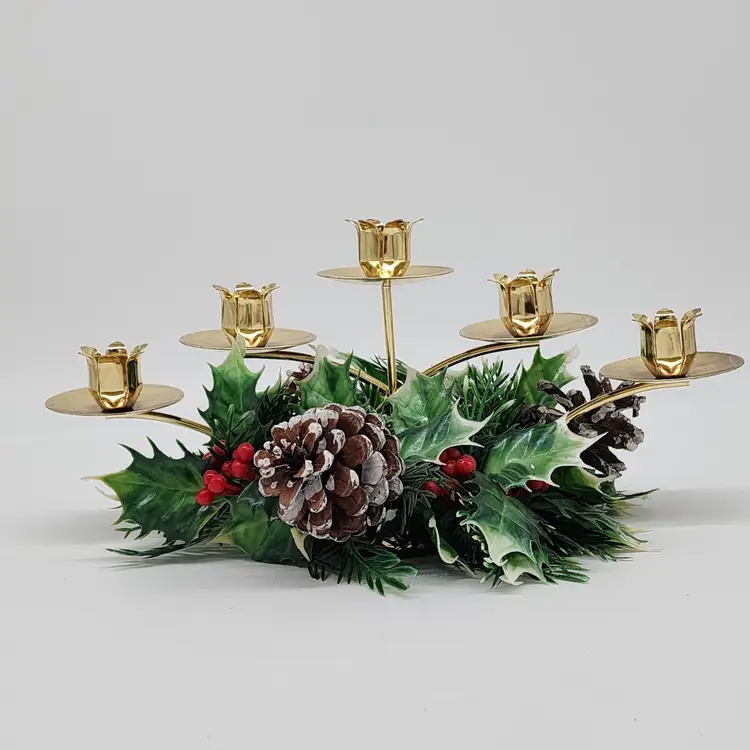 Kitschy Candelabra Candle Centerpiece Christmas Berries Pine Cones Poinsettia VTG